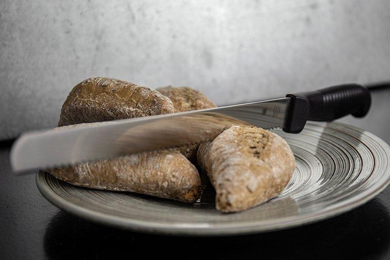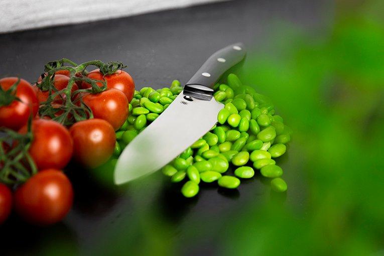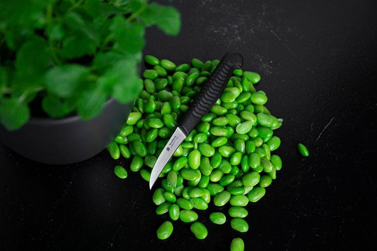 The other kitchen knives, amongst which an exceptionally long bread knife, two paring knives (with and without serrations), a utility knife with SpyderEdge and a small turning knife, have a MBS-26 steel blade. The handle is comprised of polypropylene - an extremely sustainable type of plastic - which is directly cast around the tang of the blade. Due to the lack of space between the handle material and the steel bacteria cannot settle in the knife.