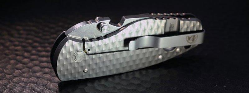 Pelton’s foldable knives are often enhanced with a cut-out that can be used as a bottle opener. Cheers! At the same time you can, while using this ‘wave’-style opener, remove the blade from your pocket with a single move, immediately opening the knife. Pelton attaches his pocket clips with one screw enhanced with a tungsten carbide glass breaker. Great for breaking glass, but also for engraving hard materials. Adding your name into your gear will be a piece of cake.